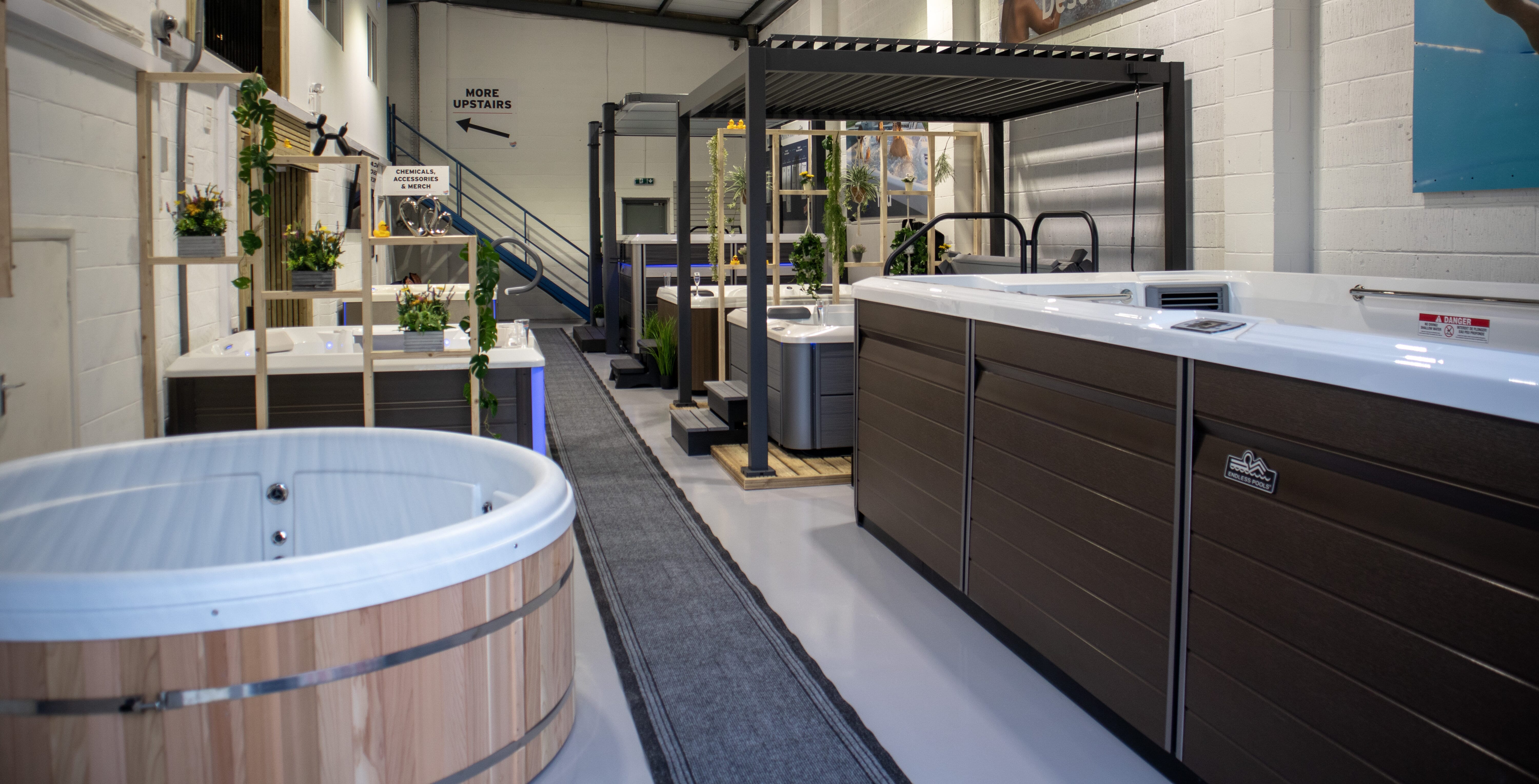 We have a wide range of hot tubs. We have two Endless Pools on display, one with a Covana automated cover. We also have two saunas, one cold plunge and lots of chemicals and accessories.